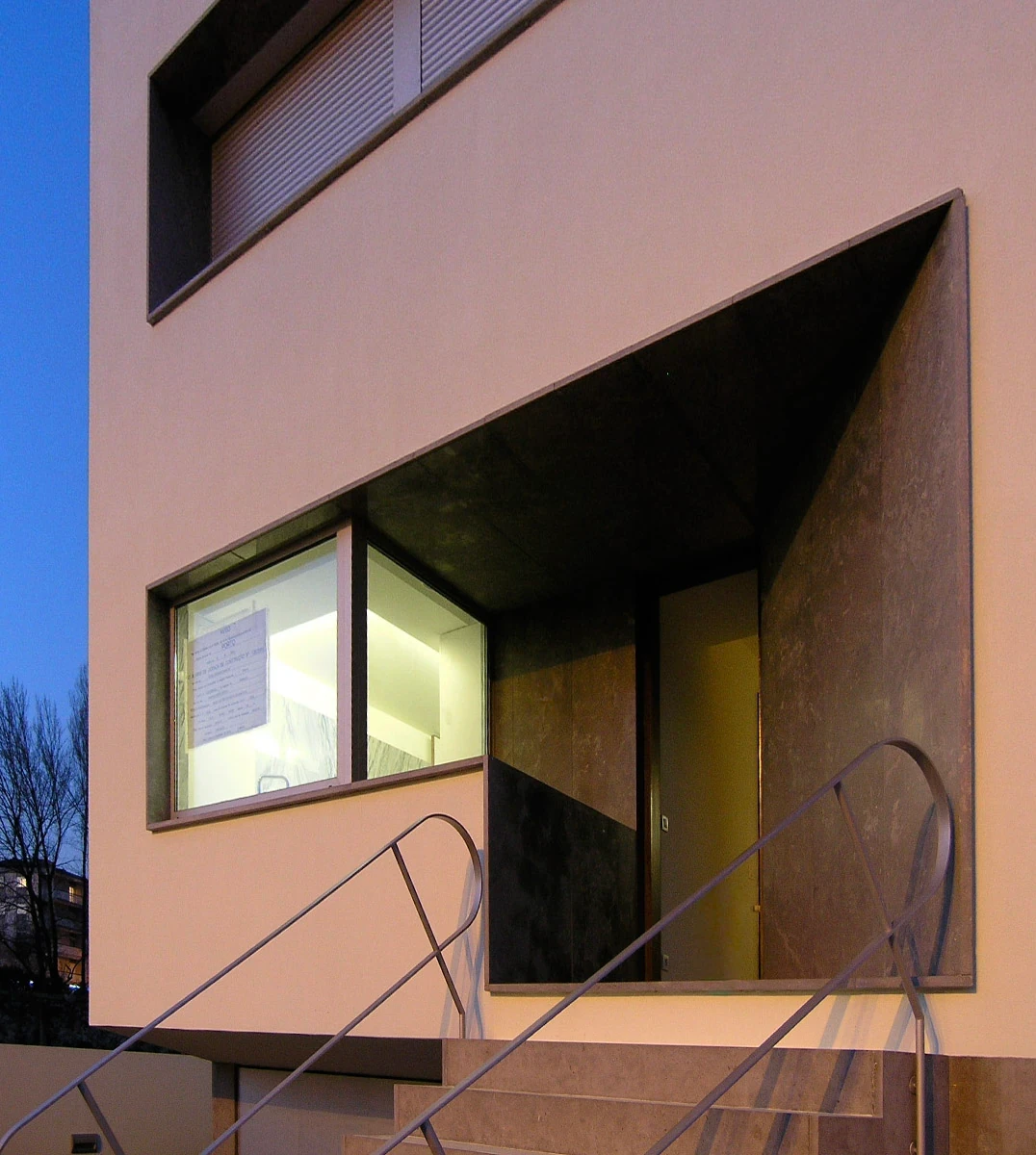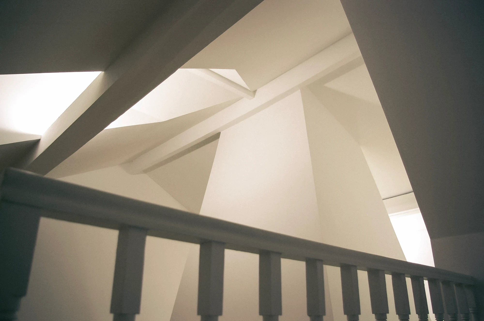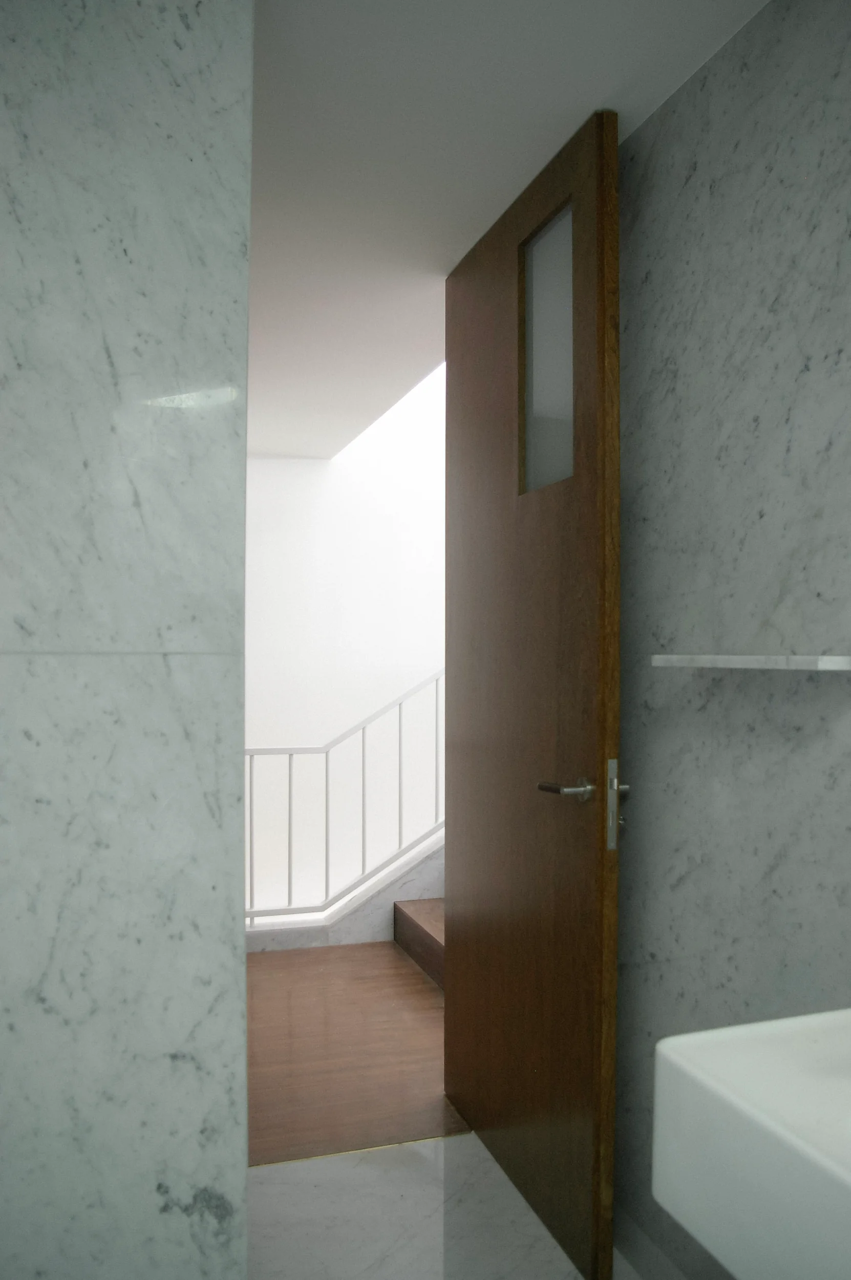 2004–2006 | Compact House III, Porto. Single Family Residence. This concludes the Compact House trilogy. The project required a strictly pragmatic approach to reconcile a tight plot with an ambitious brief of four bedrooms and parking for two vehicles. Consistent with its predecessors, the design revolves around a vertical void. A full-height central core is illuminated by a distinctive trapezoidal skylight that drives natural light deep into the plan.