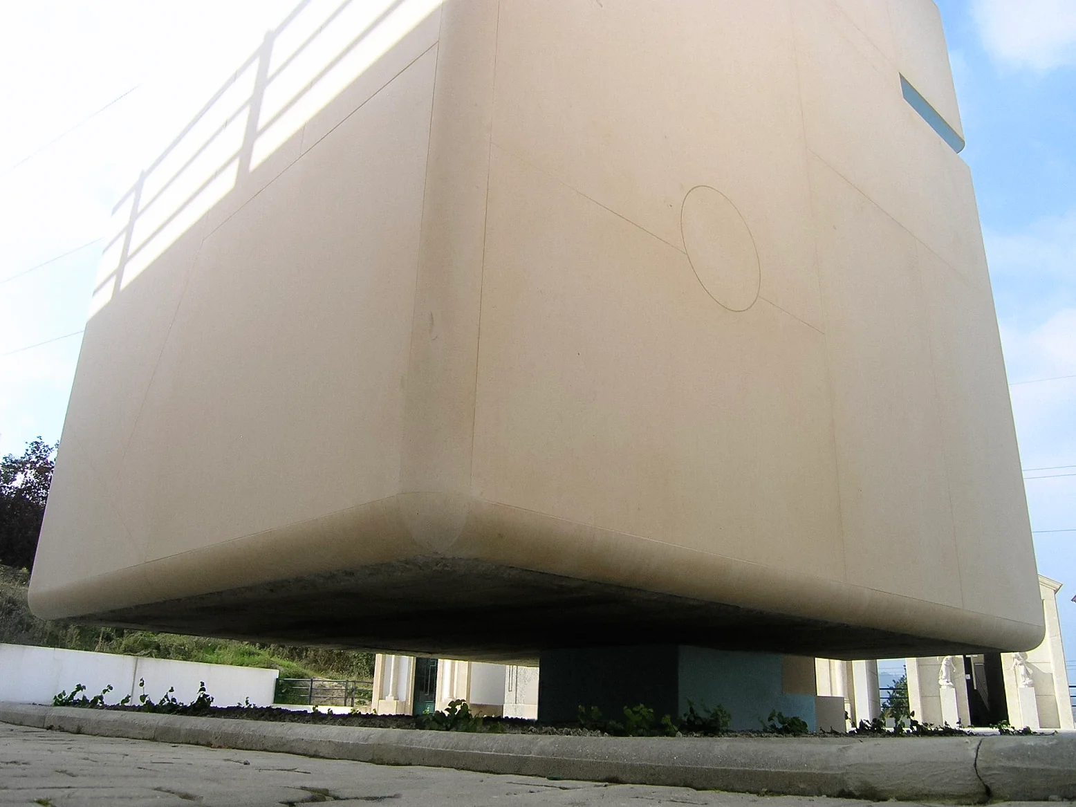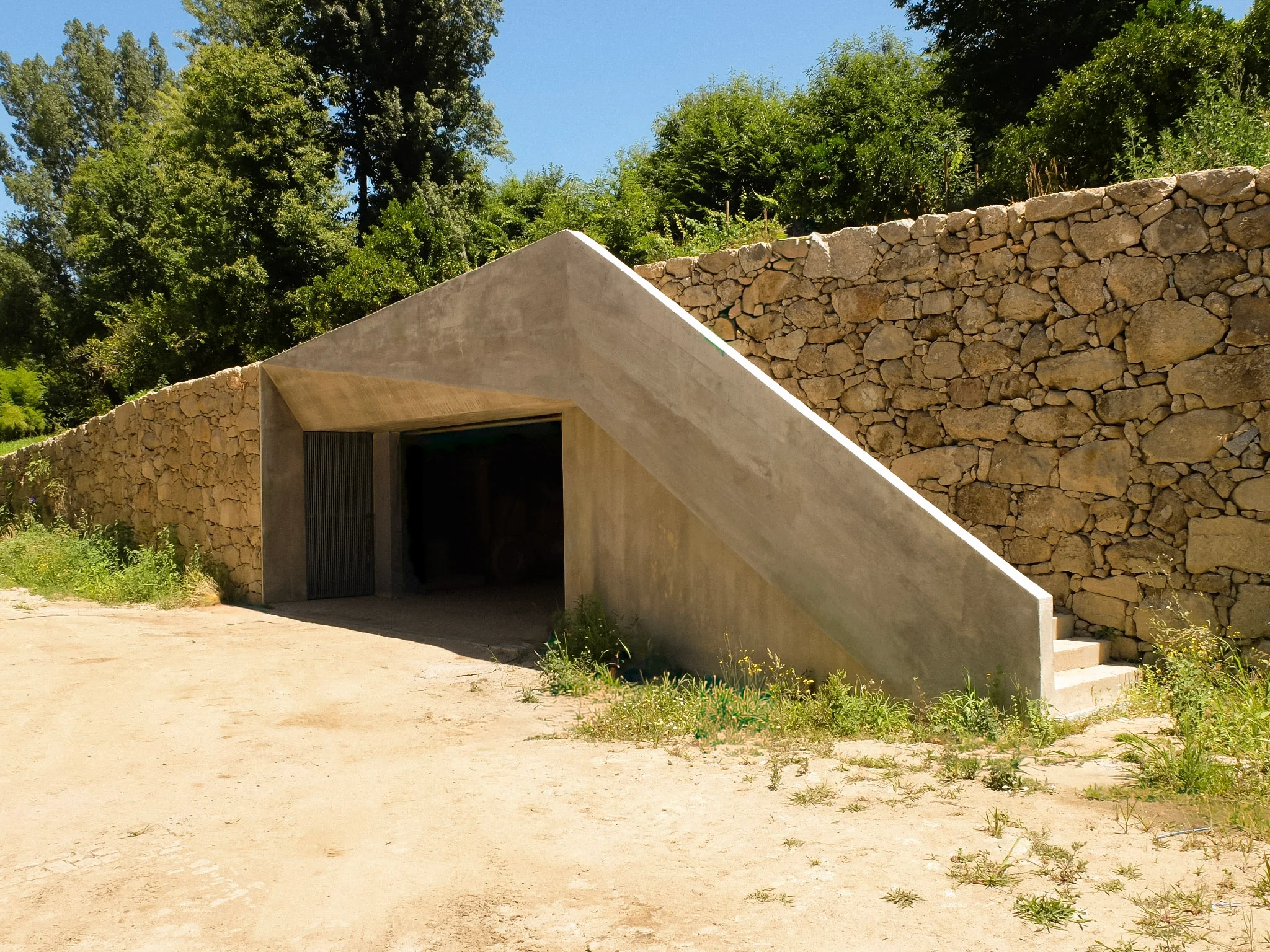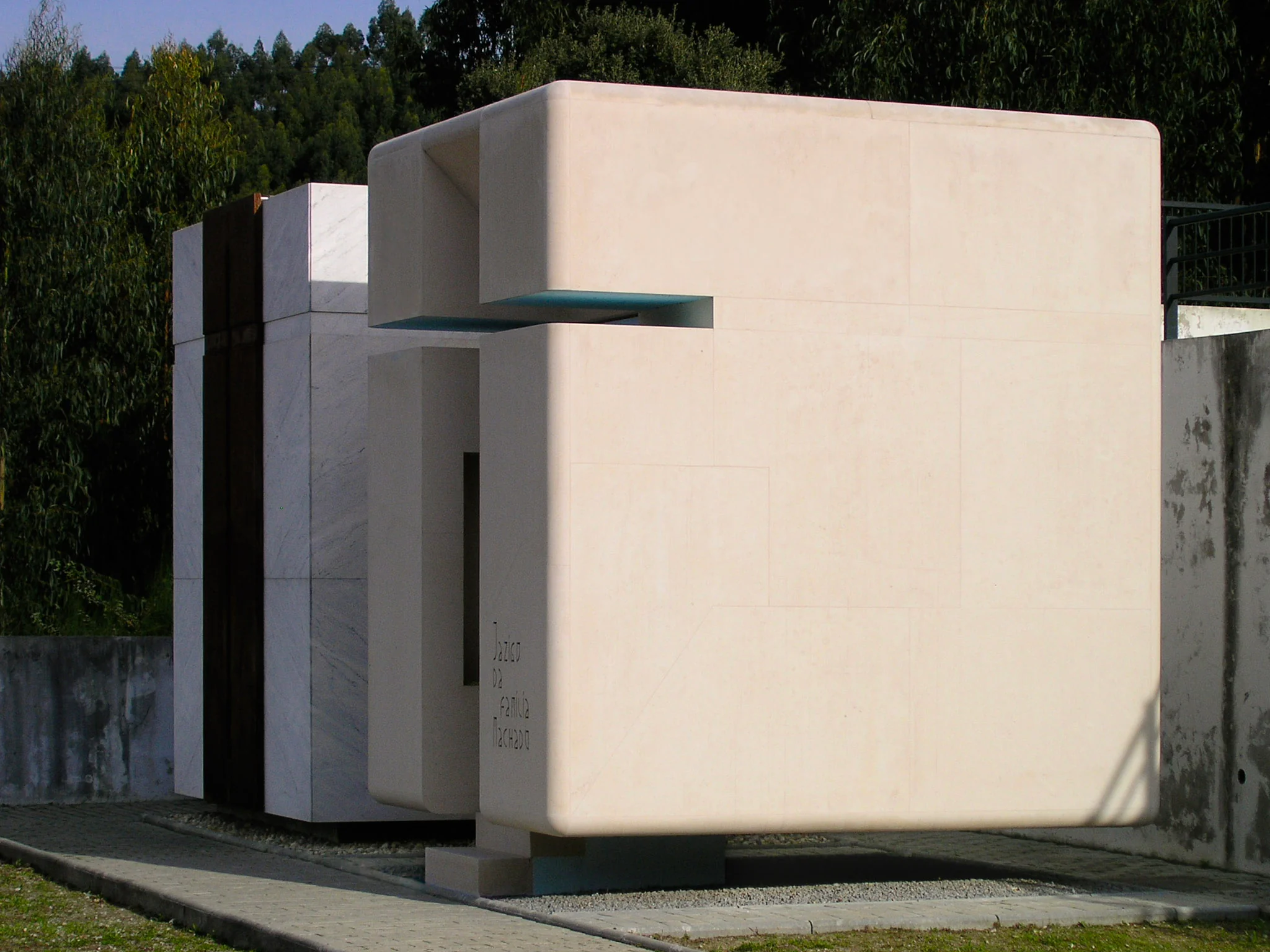 2004–2006 | Machado's Family Mausoleum, Serzedelo. This project began with a specific and emotive request. The family patriarch, facing terminal illness, expressed a deep aversion to being buried underground. He asked us to design a resting place where he could remain suspended above the earth. We responded with a monolith of rounded stone that appears to defy gravity. The entire volume is cantilevered from the access steps and hovers completely clear of the ground.