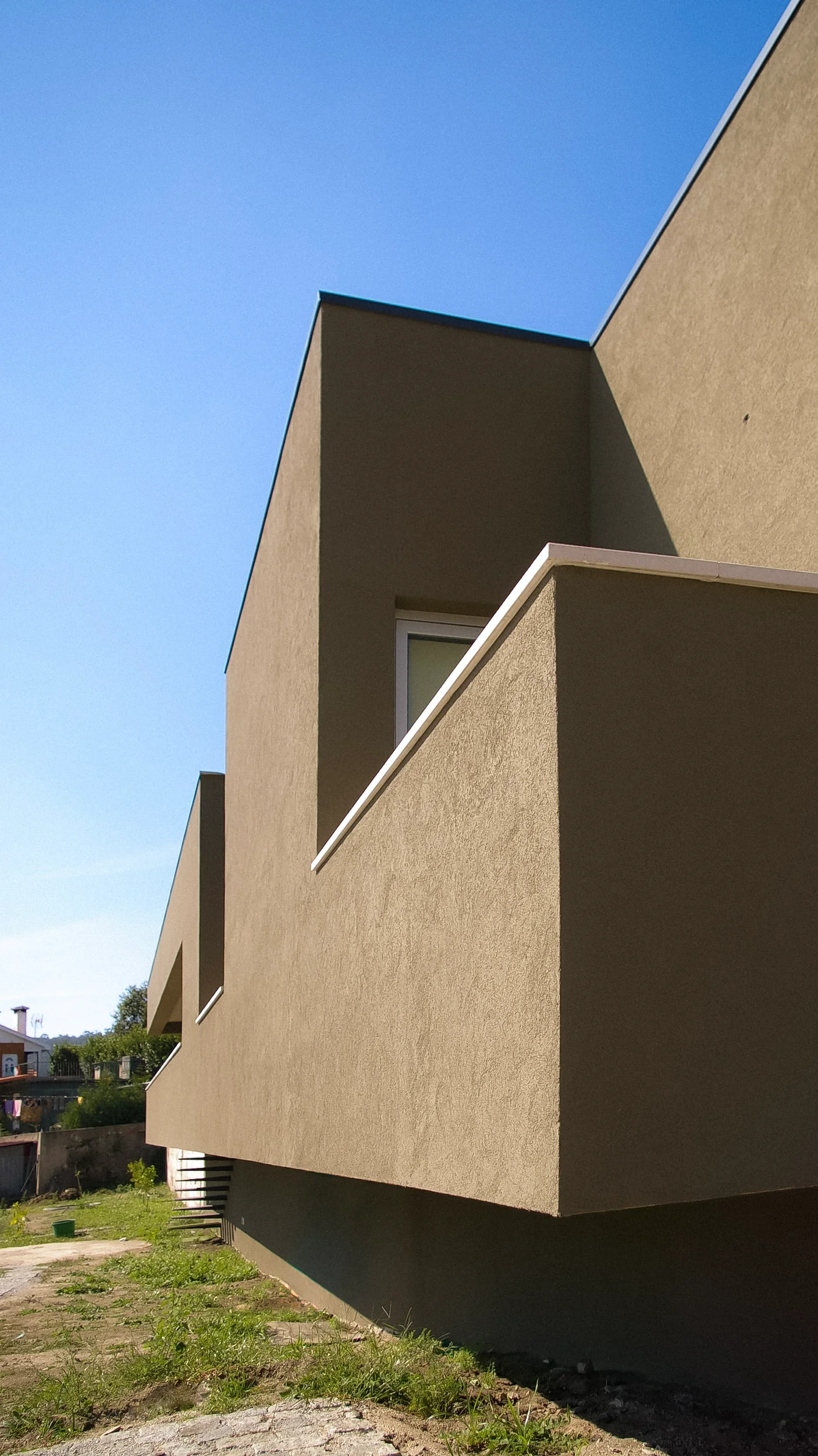 2003–2008 | Clone.aid House, Joane. Two False Semi-Detached Houses. Designed for Artur's cousins, these two houses engage in a game of mirrors. We call them false semi-detached because we subverted the standard typology to solve a family problem of equity. Challenging the unique topography, we established two distinct axes of symmetry. The first faces the street to organise the garages in a conventional urban rhythm. The second axis pivots downhill to orient the living spaces toward the landscape. This geometric sleight-of-hand ensures both units enjoy identical solar exposure, expansive views, and completely independent gardens.