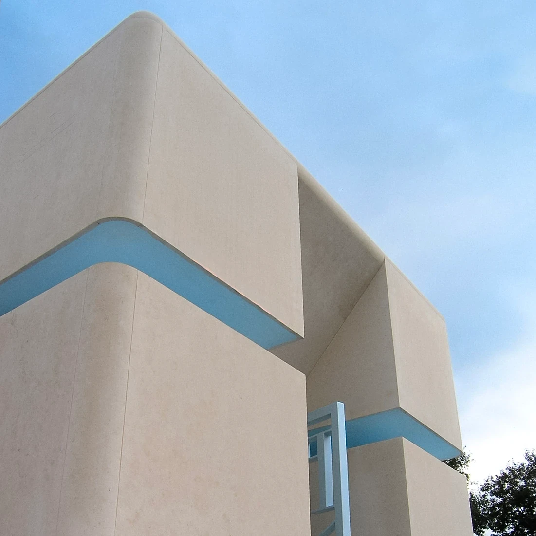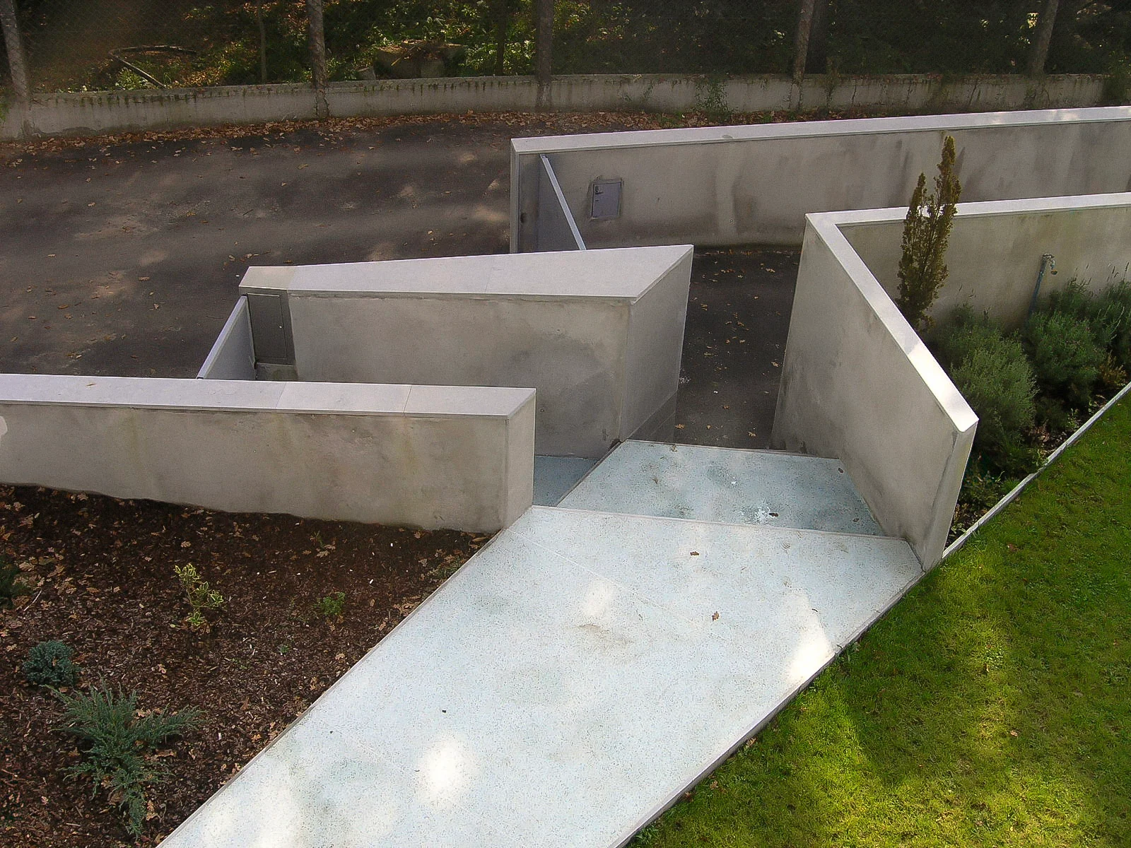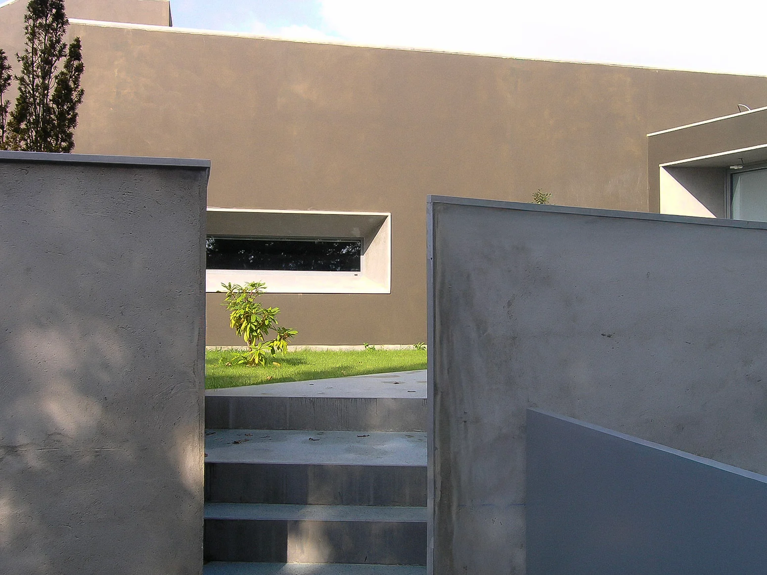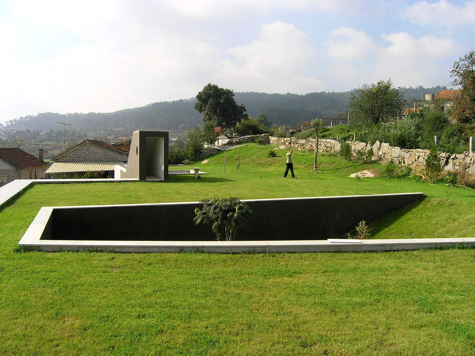 2003–2006 | Bellynavel House, Joane. Single Family Residence. This house was designed to be walked upon. Buried into the hillside, the architecture is invisible from above and signaled only by an interplay of ramps and stairs. Built for a contractor who fully engaged with the radical proposal, the house unfolds over three levels. These include a subterranean garage, a living layer stretching along the contour, and a roof garden acting as a landscape punctuated by architectural follies.