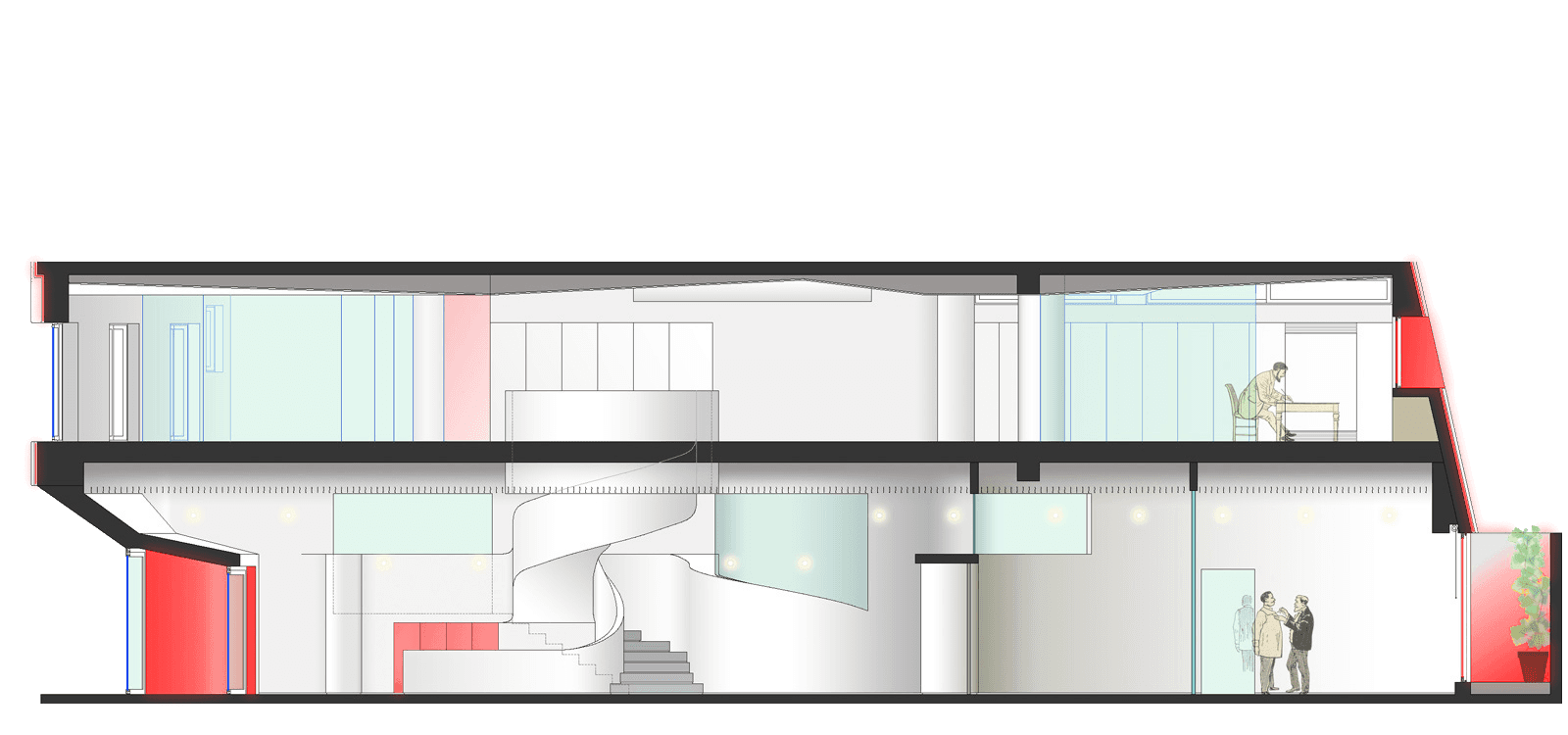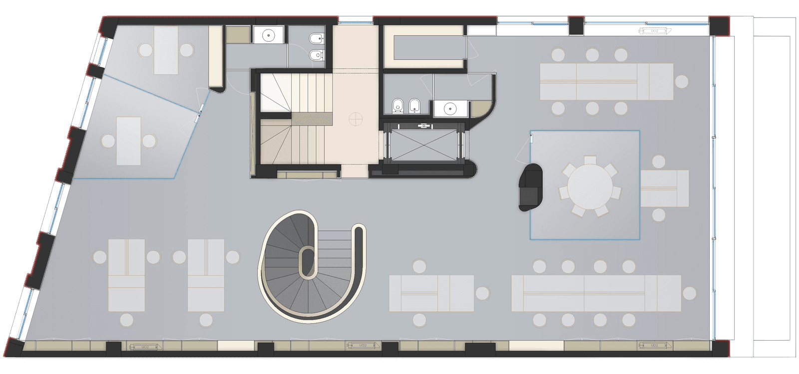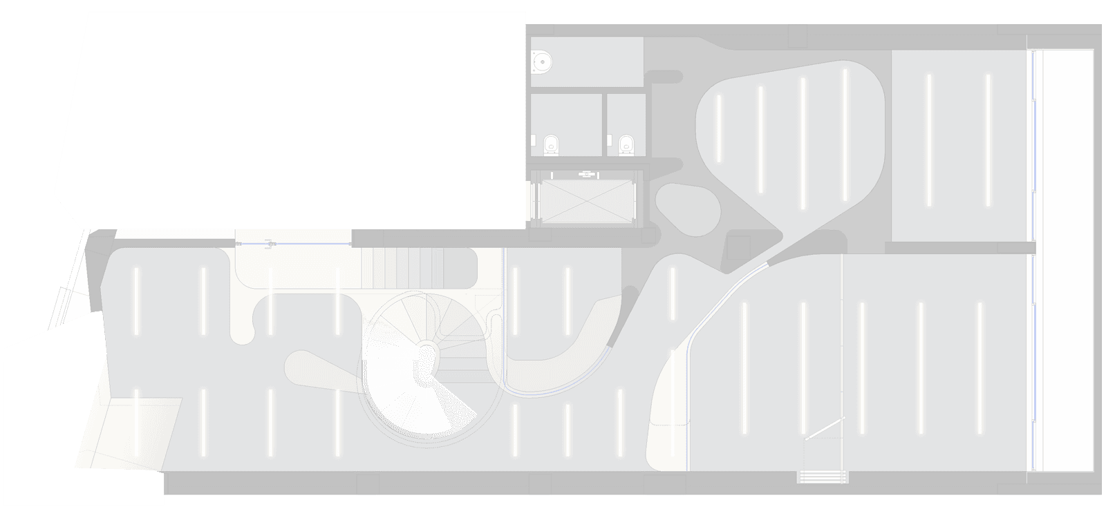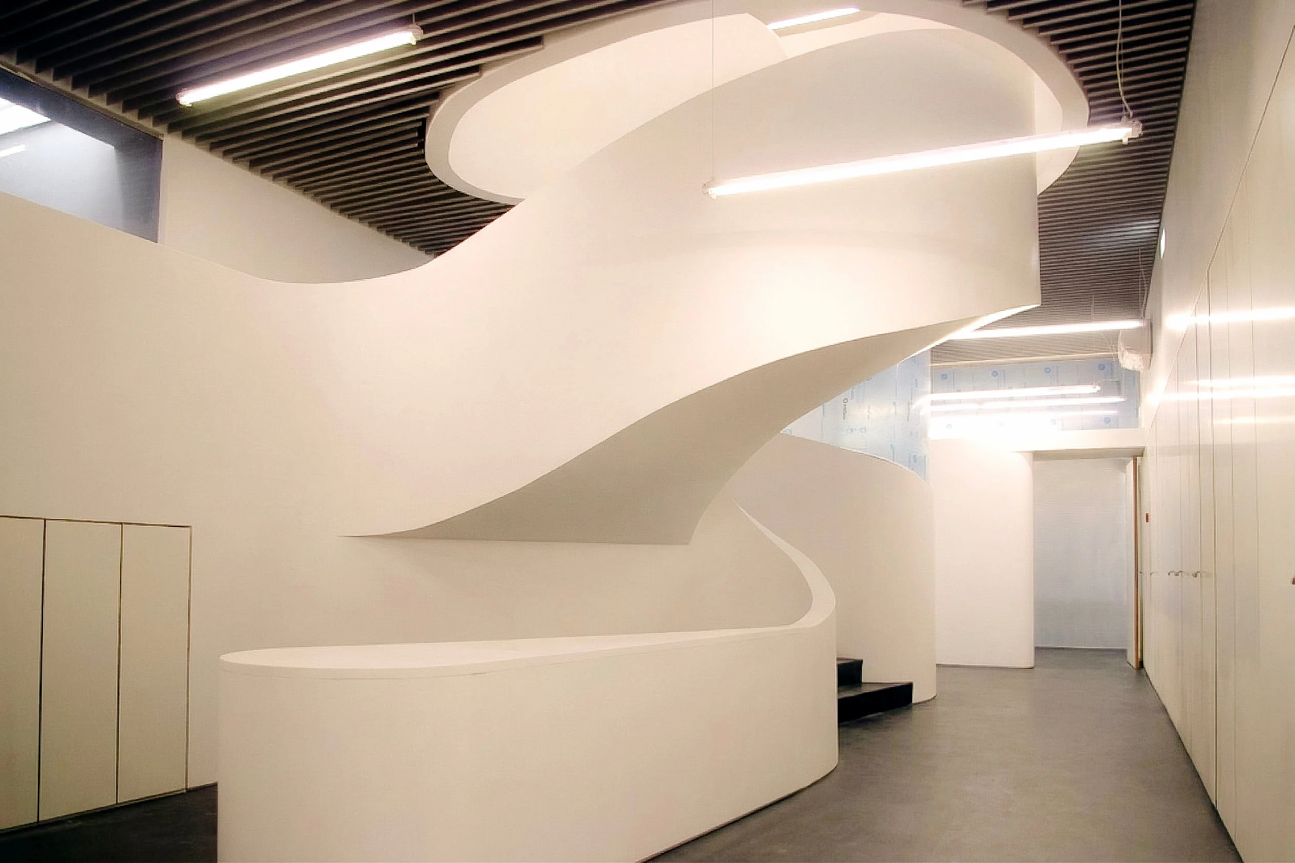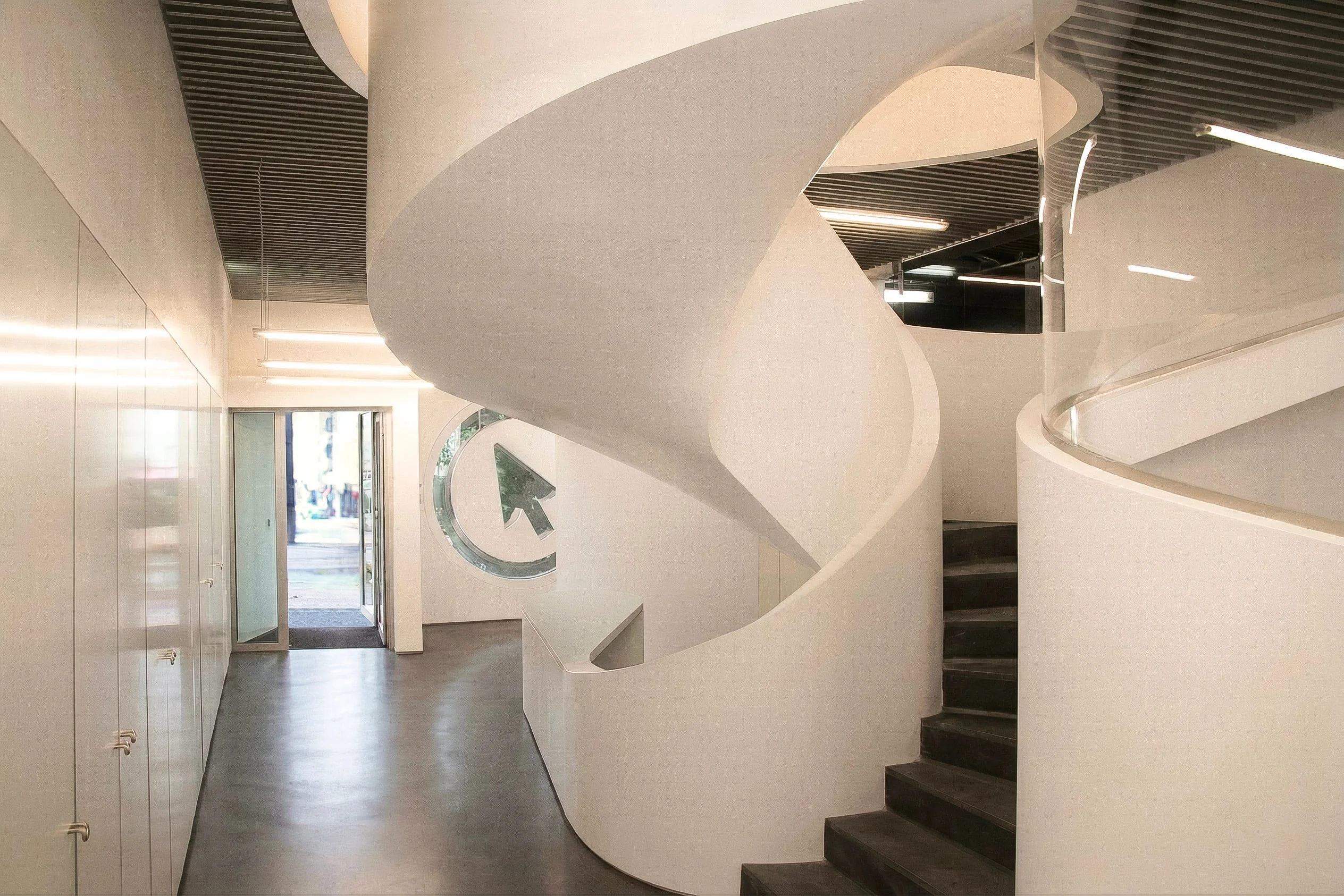 While the external diamond was the public statement, the internal reorganisation remains the quiet triumph. On the ground and first floors, we poured a concrete spiral staircase. We offset the top balustrade from the stairs themselves. This creates the distinct sensation that the staircase is simply dissolving into a void. We also took advantage of the tall entrance ceiling. We placed the company servers on a mezzanine behind darkened glass. This allowed visitors to glimpse the blinking brains of the software company, while conveniently venting all that extreme server heat straight out to the road.
