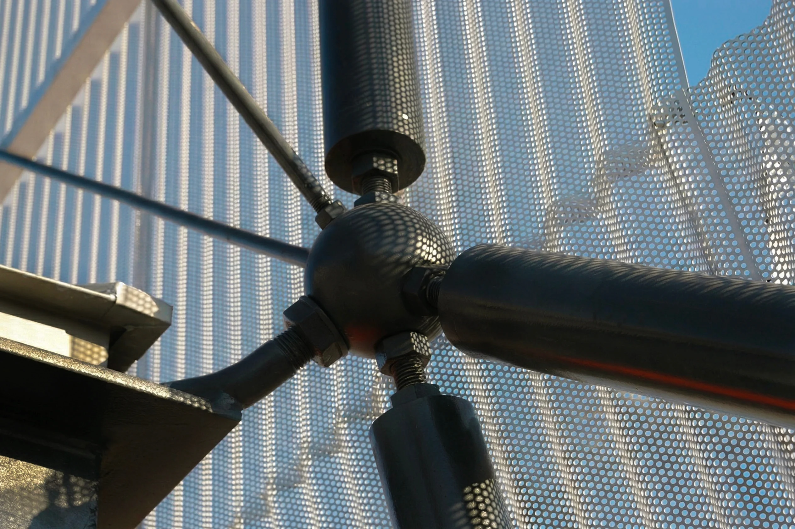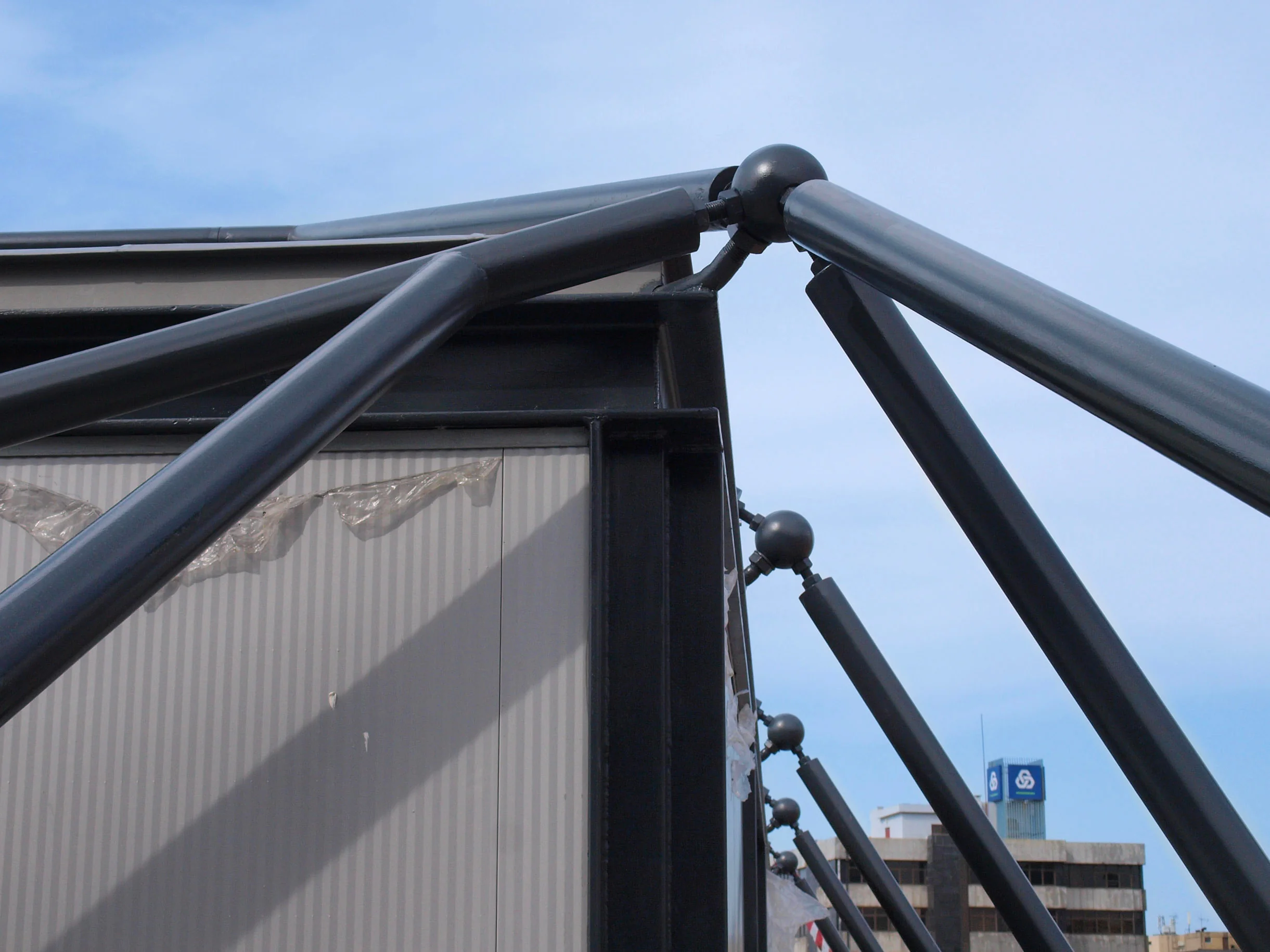 To attach this new mesh to the old building, we sat down with our structural engineer, Francisco. We devised a cheap and highly efficient system using solid steel spheres. We anchored these spheres to the existing concrete and the new penthouse framework. The centre of the sphere acted as a universal joint. It became the single pivot point where all the unpredictable angles and planes of the new facade could safely meet. It solved a massive geometric headache with a simple metal ball.