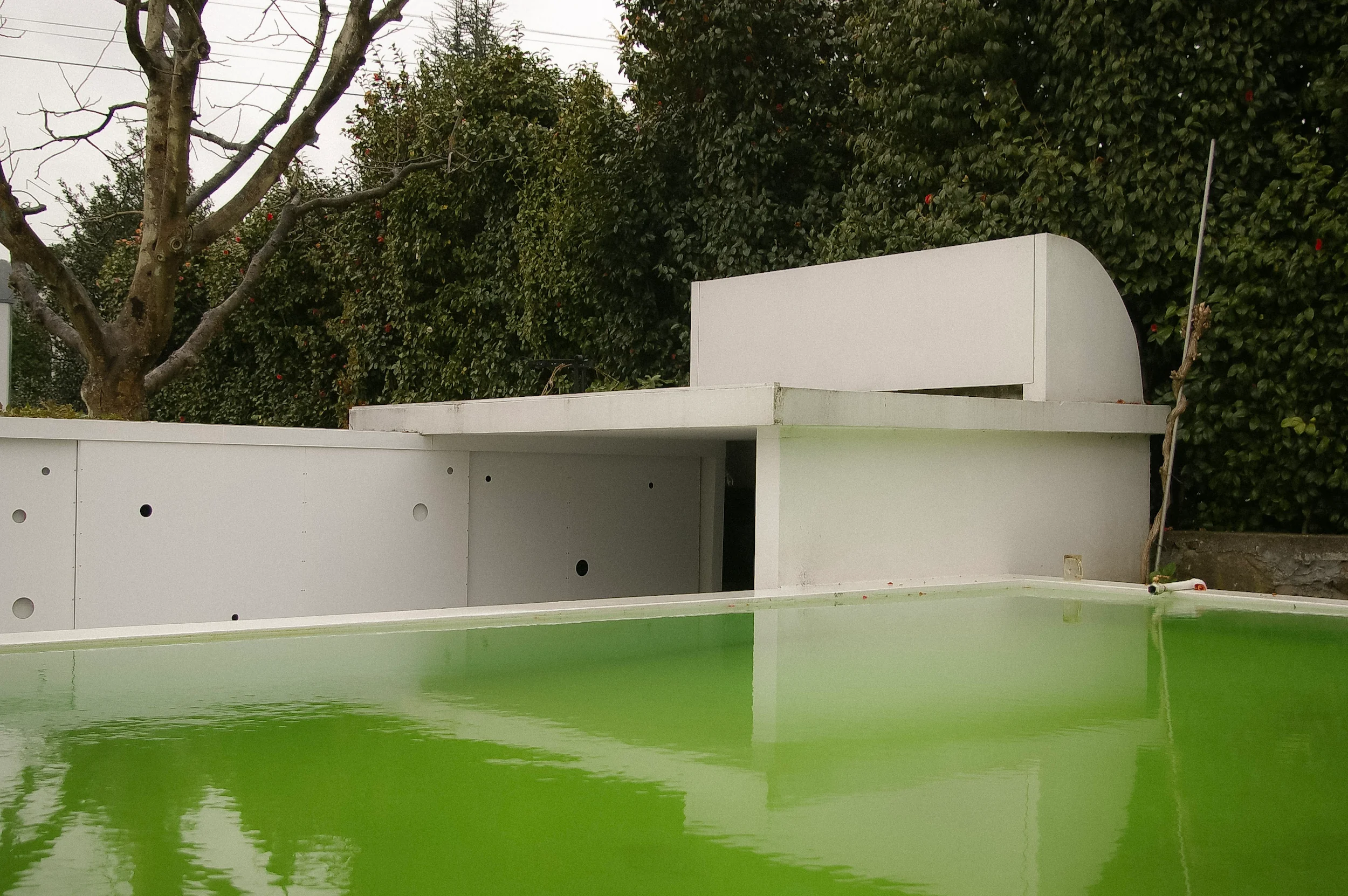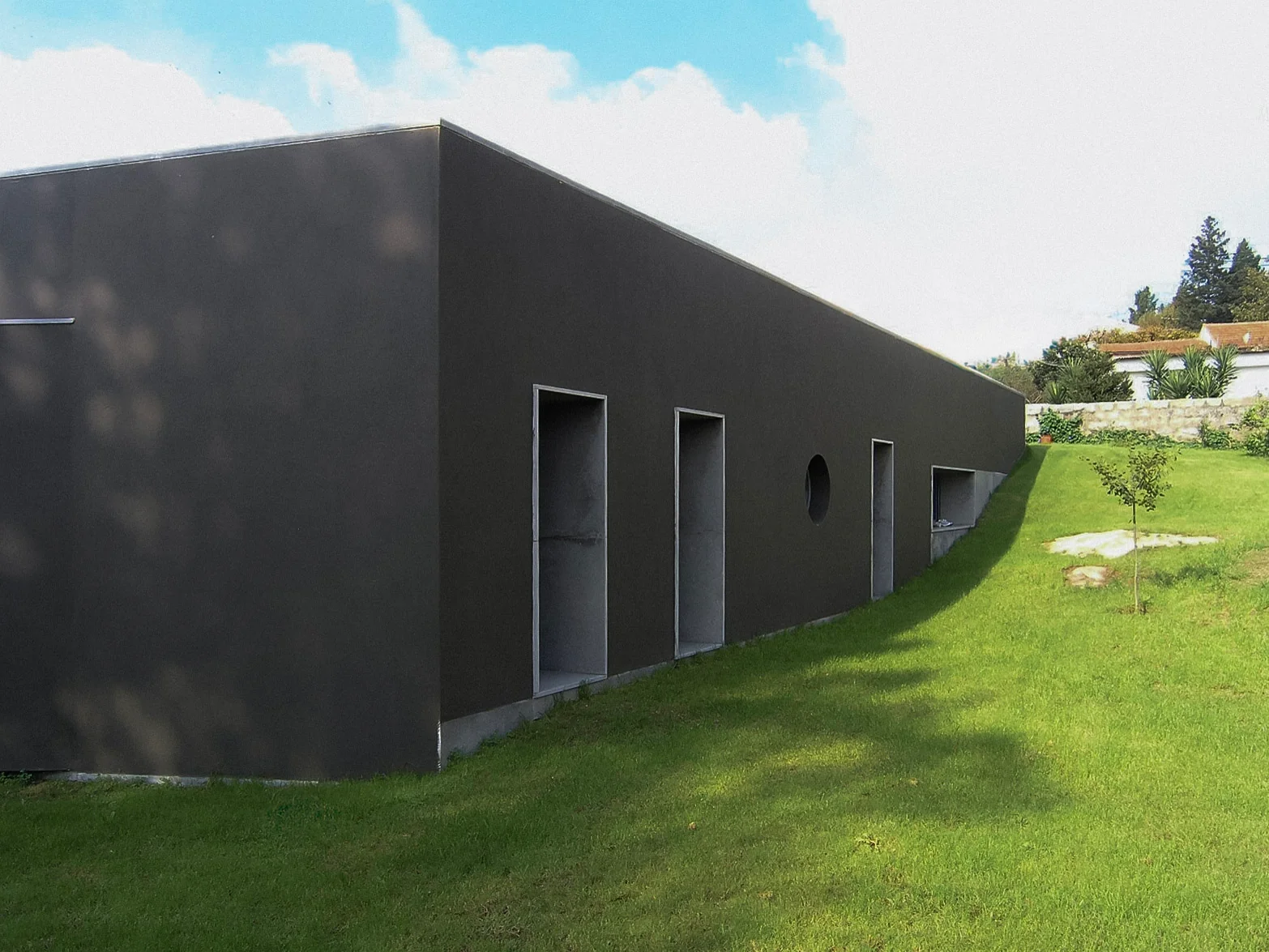 2008–2009 | Costa Ferreira's Family Mausoleum, Joane. This monolithic volume of concrete and Ataíja limestone hovers just a hand's breadth above the ground. Inside, a central courtyard holds a cypress tree as a symbol of endurance. Instead of traditional casted formwork openings, we core-drilled through a metre of solid wall to excavate light. Today, vegetation grows through these perforations to integrate the building with nature.