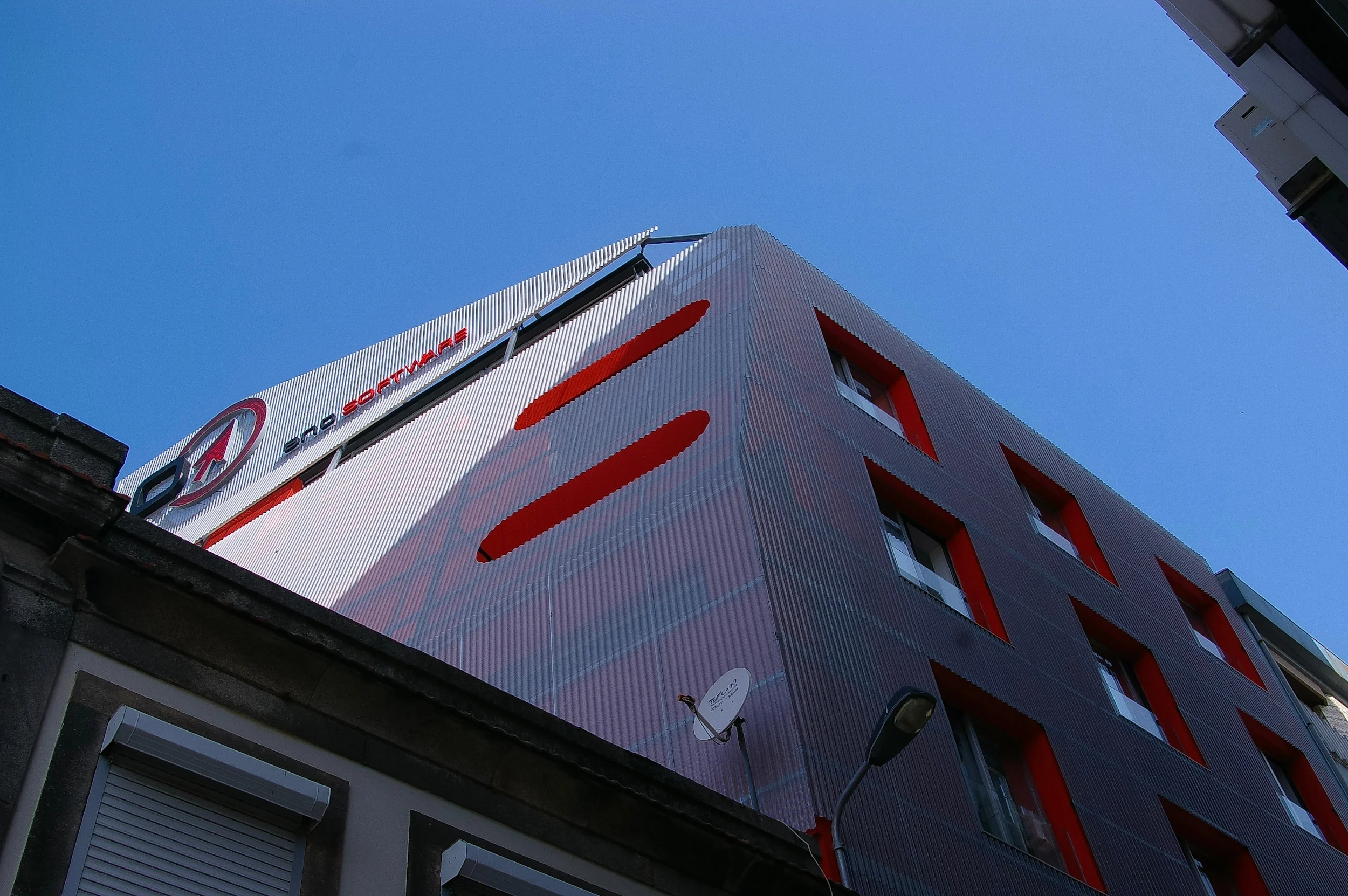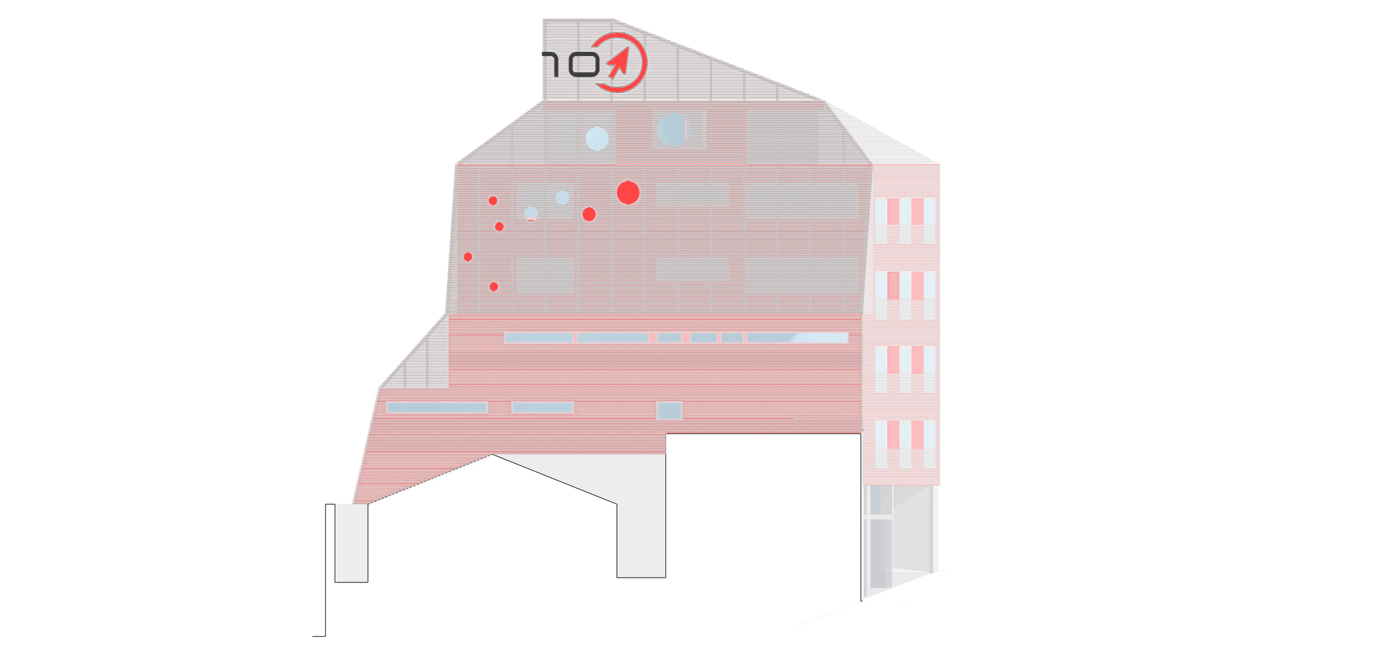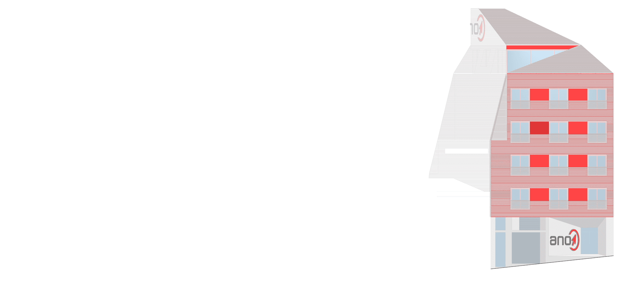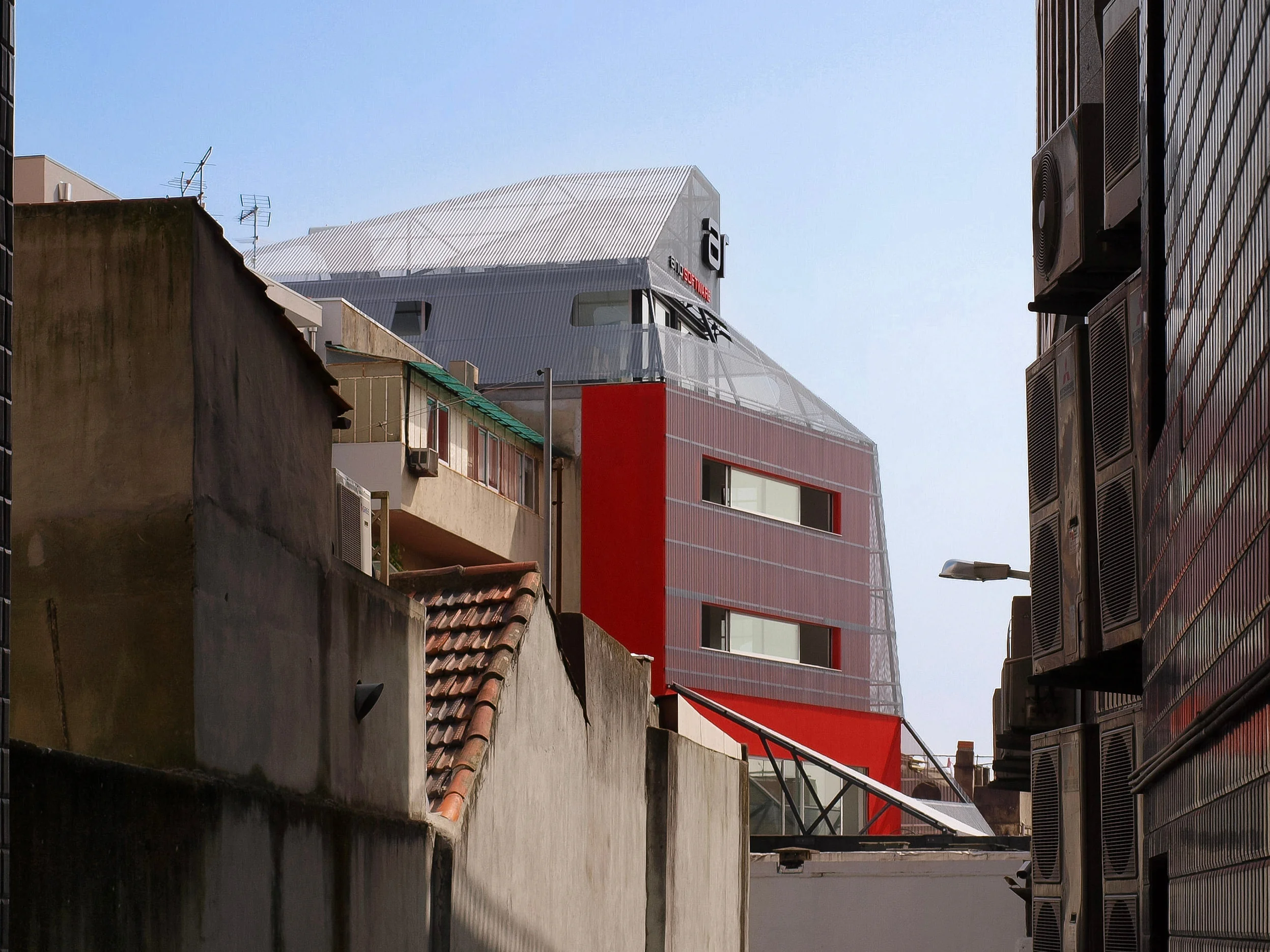 2009–2011 | ANO Software Head Office, This project presented a distinct challenge: making an ordinary 1980s building visible. We stripped the roof to install a penthouse office with an exceptional view. We then encapsulated the entire original envelope in a new metal skin. Using a translucent metal mesh stretched over a steel sub-structure, we leveraged the existing edges to generate a new prismatic form. This diamond shape was derived from the inside out. While the external transformation was the public statement, the internal reorganization remains the quiet triumph of the project.