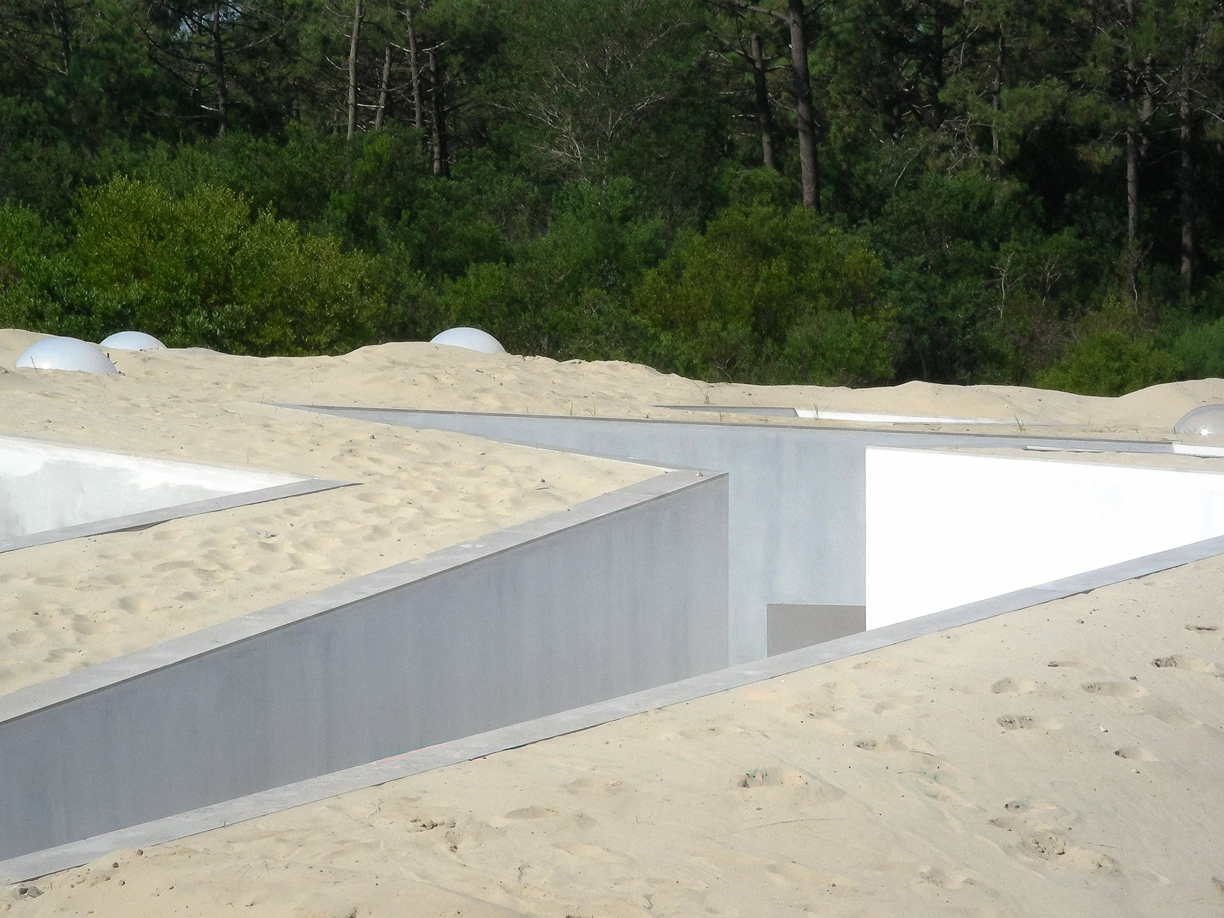 2003–2008 | Dune House, Torrão do Lameiro. Single Family Residence. Located in the wild landscape of Torrão do Lameiro, the house acts as an artificial dune camouflaged by native vegetation. Sculptural openings puncture the volume to carve out space for domestic life within the sand. Commissioned by a cousin and partner who are specialists in oceanography and aquaculture, the project was a true family collaboration inspired by their adventurous spirit.