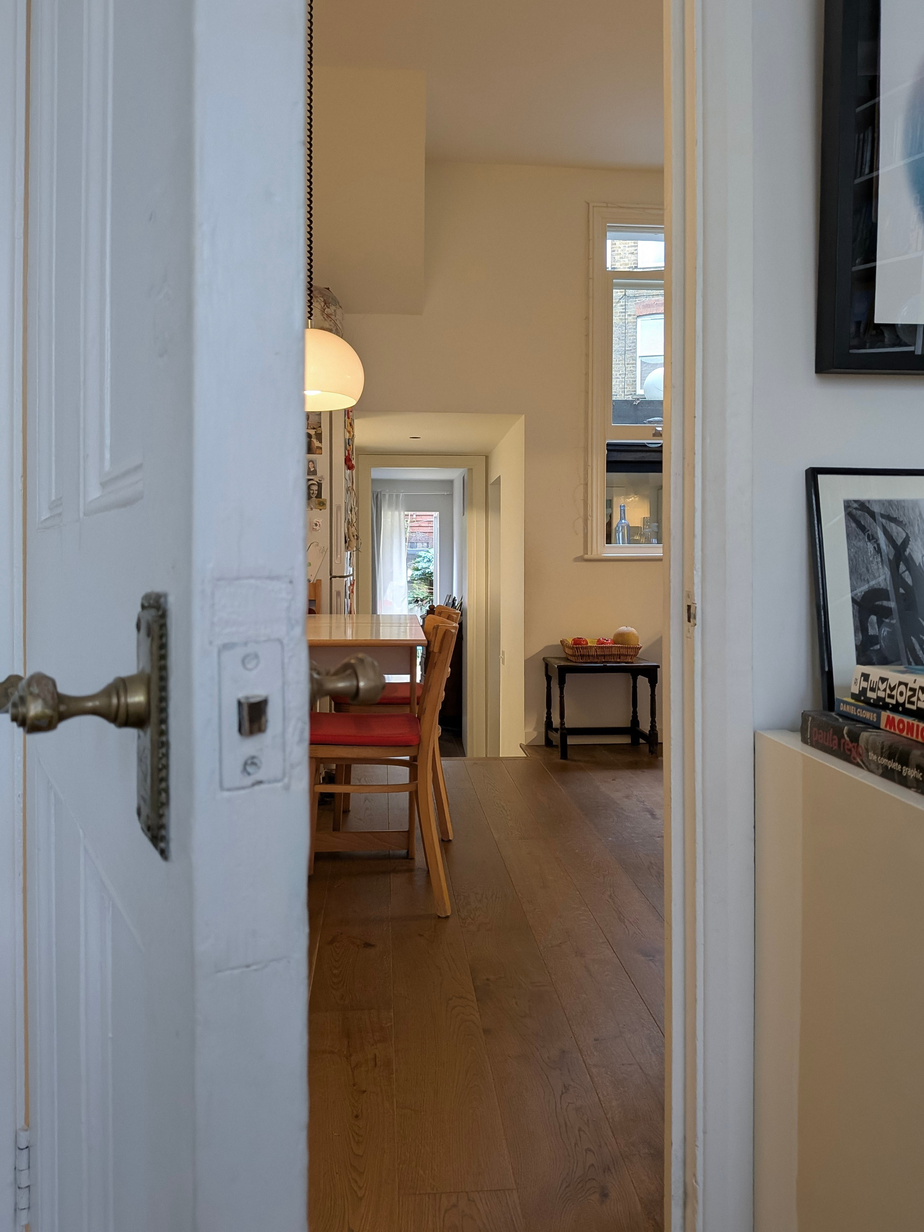 The magic of the plan happens in the middle. A natural split of three steps down allows identical light to reach the central kitchen and dining core. We changed the bathroom entrance to the lower distribution space, which created a cloakspace and a tiny courtyard next to the kitchen. This also allowed us to slot the laundry and boiler paraphernalia underneath.